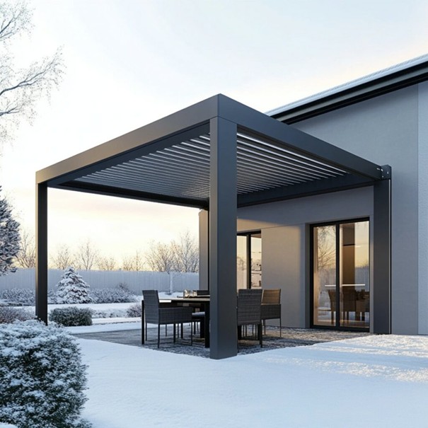 Nowoczesne pergole aluminiowe to konstrukcje całoroczne, odporne na deszcz, śnieg i wiatr. Dzięki regulowanym lamelom można dostosować stopień osłony do pogody: latem zapewniają przyjemny cień, jesienią chronią przed deszczem, a zimą skutecznie zabezpieczają meble ogrodowe przed śniegiem. Dodatkowe, solidne przesłony boczne sprawiają, że nawet chłodne i wietrzne wieczory miło jest spędzać w ogrodzie lub na tarasie.