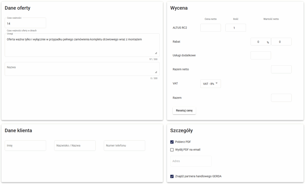 Po zakończeniu konfiguracji drzwi, przycisk „Generuj PDF” automatycznie przenosi Cię do formularza, w którym znajdziesz kompletne podsumowanie zamówienia.