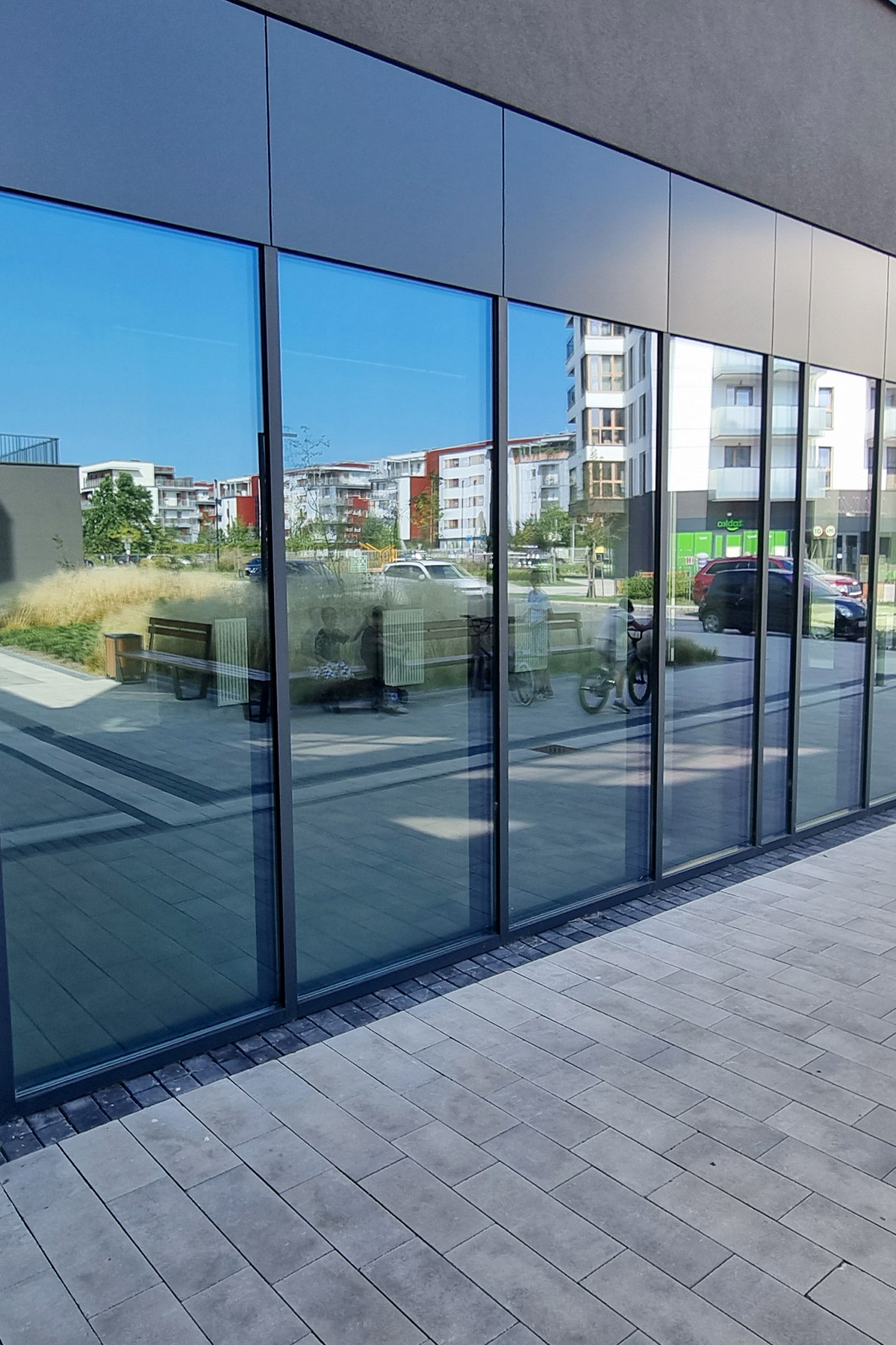 Wykonanie, dostawa oraz montaż witryn zewnętrznych w systemie fasad słupowo ryglowych z profili aluminiowych.
