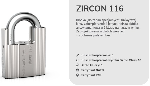 Kłódka pałąkowa certyfikowana GERDA ZIRCON z chronionym pałąkiem S116 nikiel satynowynajwyższa w klasie zabezpieczenia - 6 (wg. normy PN-EN 12320:2013) dzięki czemu kłódka ZIRCON spełnia wymagania prawne i techniczne dotyczące ochrony, transportu oraz przechowywania broni, amunicji i innych niebezpiecznych materiałów lub narzędzi: