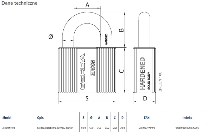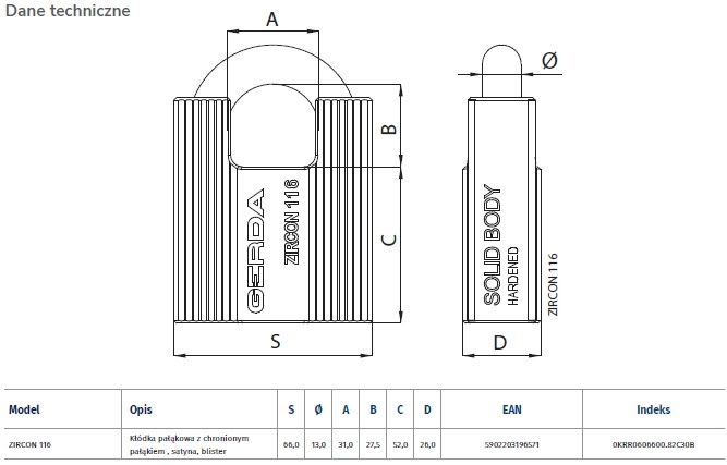 Gerda ZIRCON to kłódka dla tych, którzy nie uznają kompromisów w kwestii bezpieczeństwa. Stworzona do ochrony najbardziej wymagających obiektów — magazynów, bram, garaży, kontenerów czy drzwi przemysłowych — zapewnia maksymalną odporność na atak mechaniczny oraz certyfikowaną skuteczność zabezpieczenia w klasie C (najwyższa dostępna kategoria).