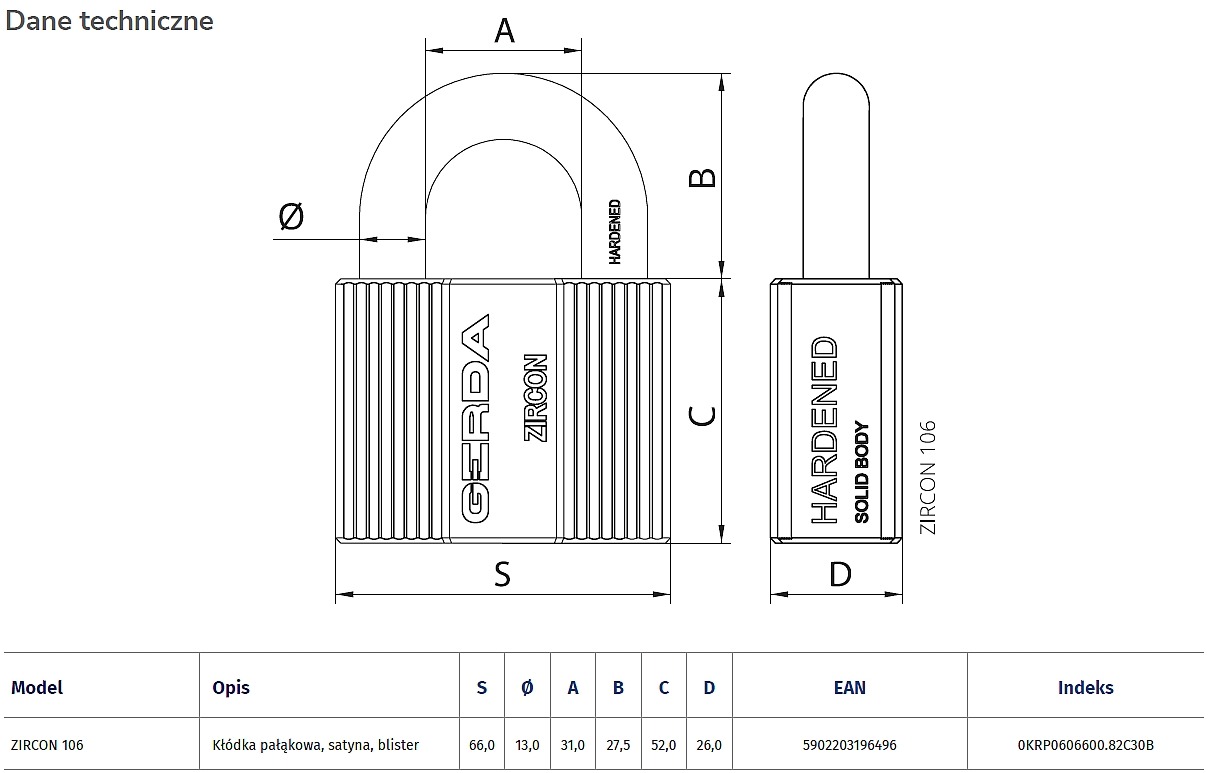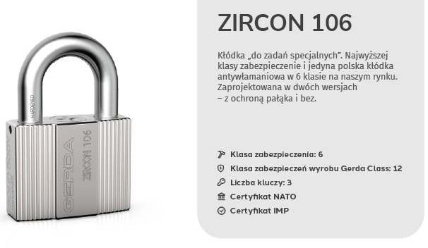 Gerda ZIRCON to kłódka dla tych, którzy nie uznają kompromisów w kwestii bezpieczeństwa. Stworzona do ochrony najbardziej wymagających obiektów — magazynów, bram, garaży, kontenerów czy drzwi przemysłowych — zapewnia maksymalną odporność na atak mechaniczny oraz certyfikowaną skuteczność zabezpieczenia w klasie C (najwyższa dostępna kategoria).