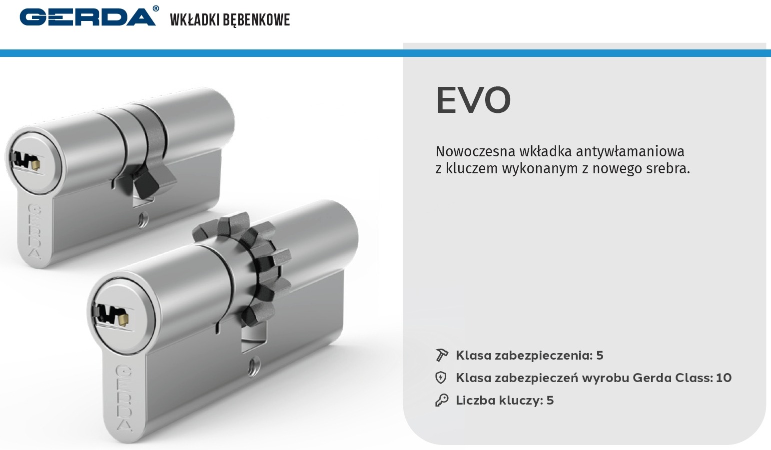 Wkładka Gerda EVO- nowoczesna wkładka antywłamaniowa z kluczem wykonanym z nowego srebra.