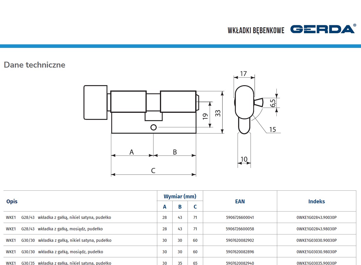 Sprawdź wszystkie dostępne wymiary wkładek WKE1z gałką- kliknij >>